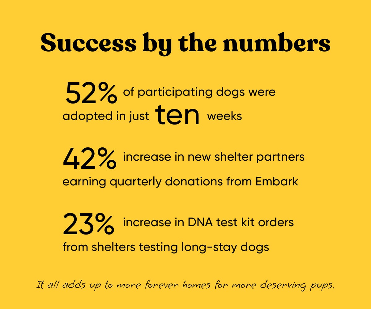 provides partner shelters with discounted DNA tests. The results reveal information on breed, health, relatives, and traits, empowering pet parents to adopt. Embark’s Long Stay, No Longer initiative specifically targets long-term shelter residents (dogs who have been in shelter care for an average of 1.5 years), by providing free DNA test kits for selected dogs.