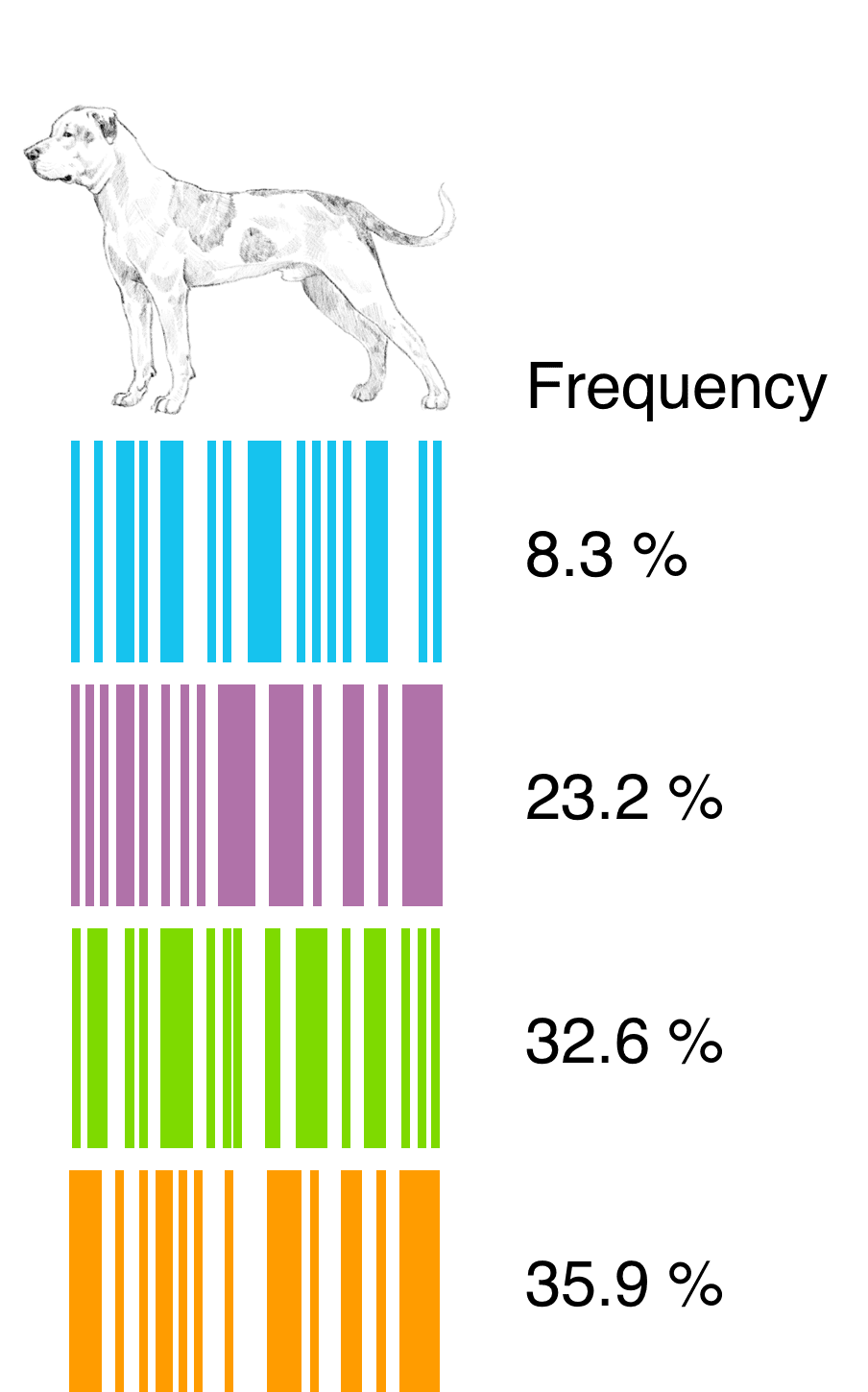 To set the stage, let’s begin by imagining the genetic variation in dog DNA sequences within a breed of dogs as a set of barcodes. Figure 1 shows that every breed or population contains a limited set of genetic barcodes. Each of these is present in that breed in a certain frequency.