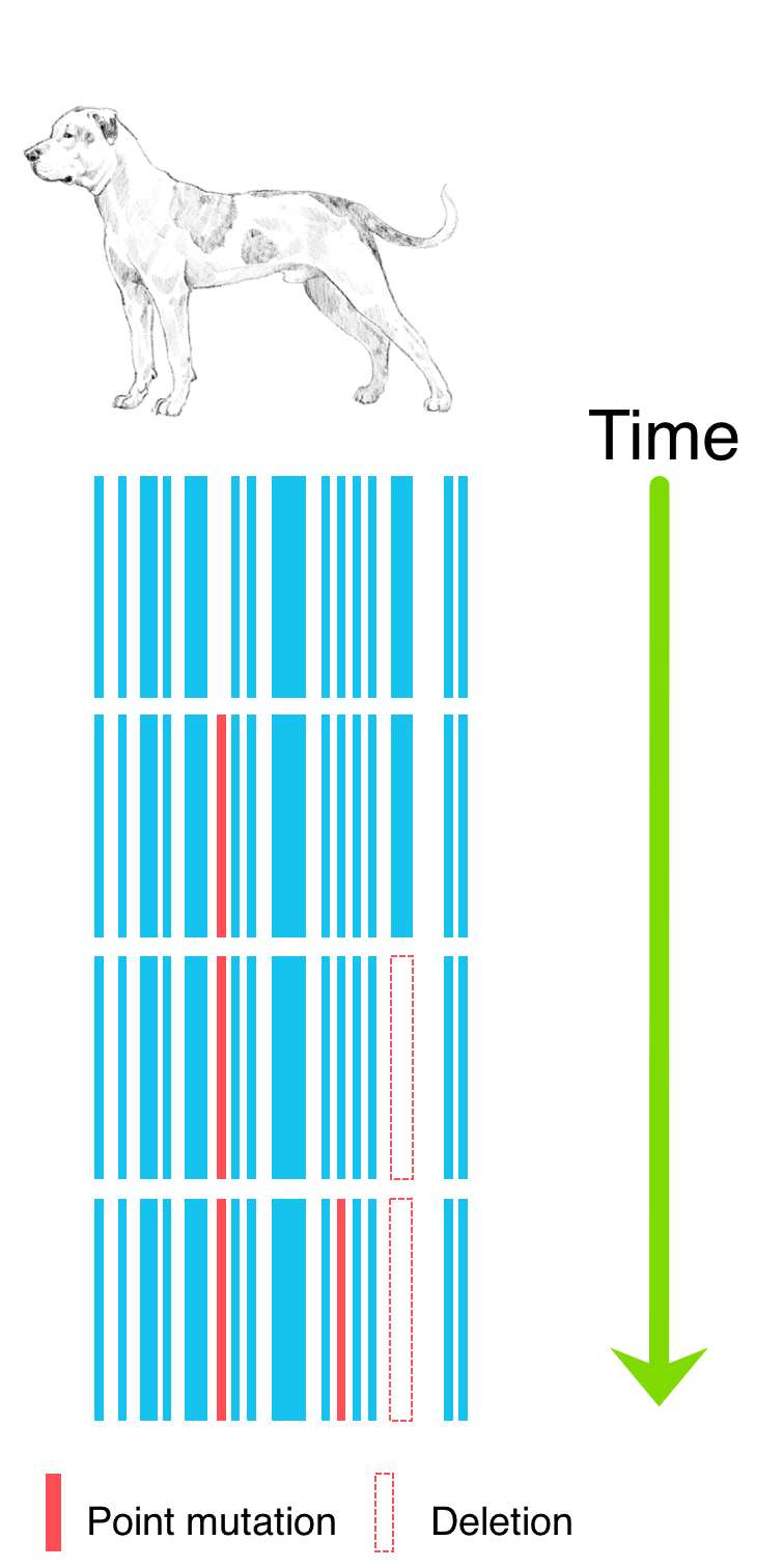 Propagation of two mutations, a point mutation and a deletion, over time in a dog’s barcode