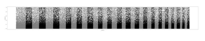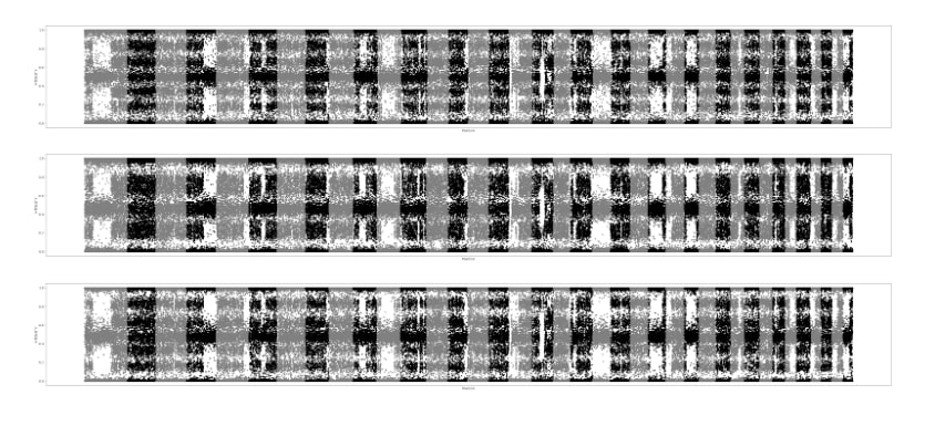So at every marker, we expect the intensity readout to reflect one of three possible genotypes. For example, if there are two alleles, let’s call them the A allele and the B allele. Then the three possible genotypes are AA, AB, and BB. If intensity is measured relative to the B allele, then we can infer genotypes based on intensity values of 0 (AA), 0.5 (AB), and 1 (BB). Most samples go through the genotyping process smoothly, so their readouts of intensity might look something like this (note that each dot in all of the following plots corresponds to a single marker, so the X-axis reflects position along the dog genome):