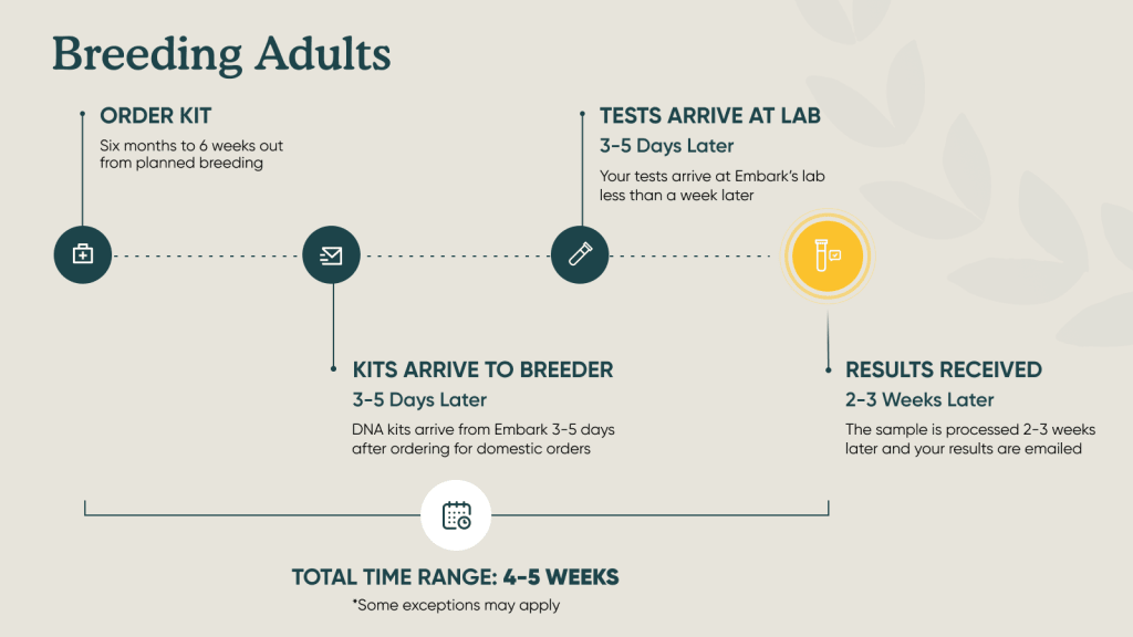 If genetic health testing (including breed-relevant genetic health condition risks and coefficient of inbreeding) is still on your to-do list for your dogs, breeders can reliably order a DNA kit from Embark as little as five weeks before a planned first breeding. Kits ordered even later may also be ready in time, but run the risk of being late from shipping delays or other hazards.